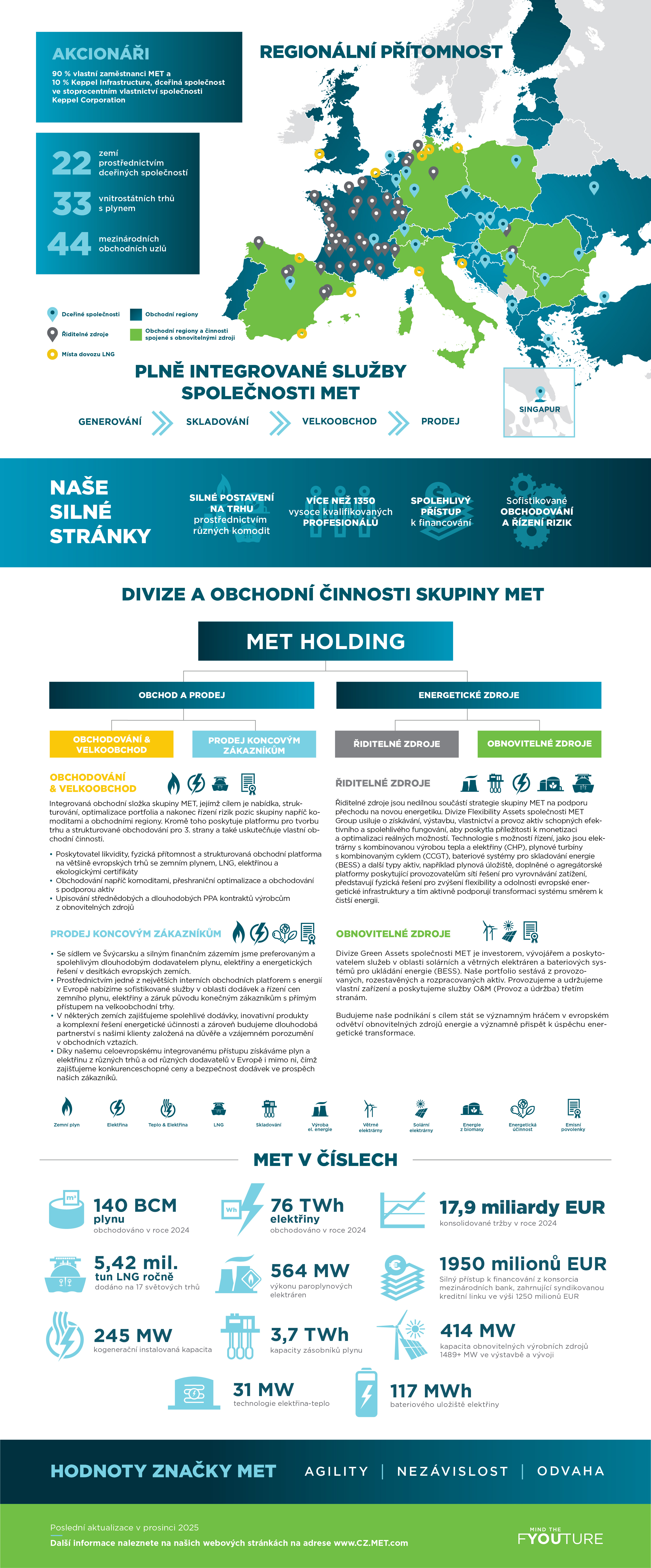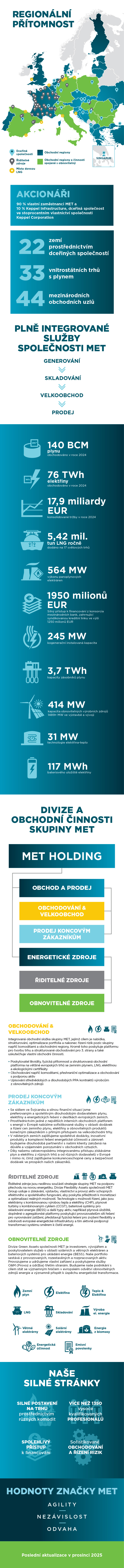 MET Group je integrovaná evropská energetická společnost se sídlem ve Švýcarsku, která se zaměřuje na velkoobchod a obchod s elektřinou a zemním plynem, stejně jako na energetickou infrastrukturu a průmyslová aktiva. Úspěch MET stojí na 3 pilířích: na talentovaných a vysoce motivovaných lidech, integrovaném modelu řízení rizik a efektivnějším řízení podnikání v porovnání s konkurencí.
